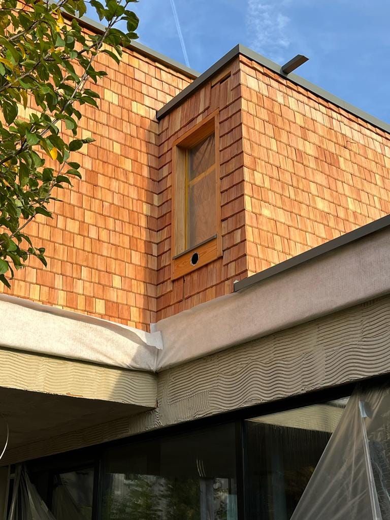 Holzschindeln sind ein bewährtes Material für die Dachdeckung. Sie bieten eine natürliche Isolierung und können Feuchtigkeit effektiv abweisen, was sie besonders in Regionen mit hoher Niederschlagsmenge beliebt macht. Dachdecker positionieren die Holzschindeln überlappend, wodurch eine wetterfeste Schicht entsteht, die das Dach vor Witterungseinflüssen schützt. - Fassadenverkleidung